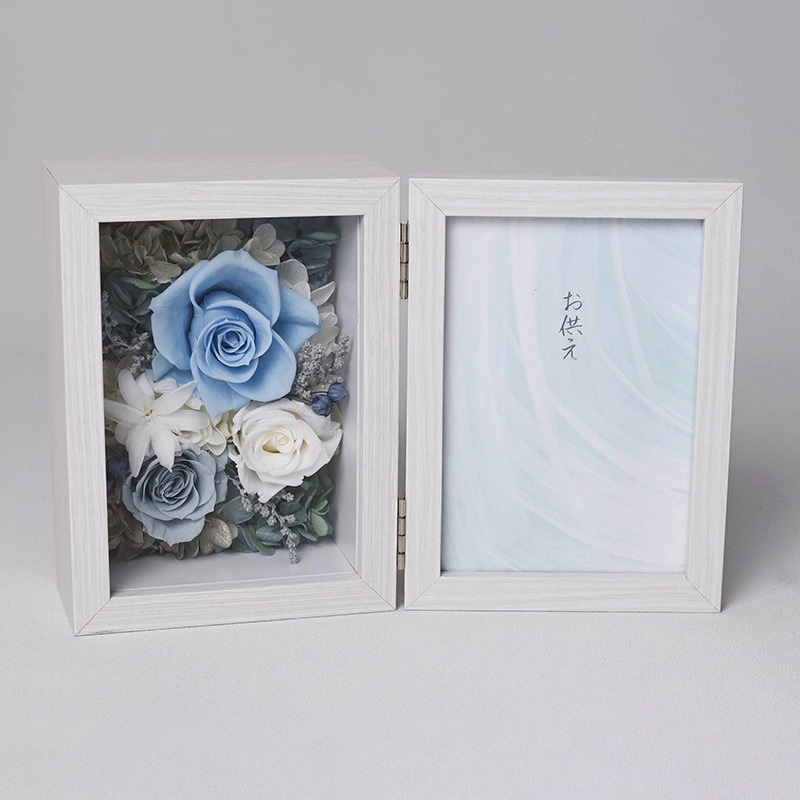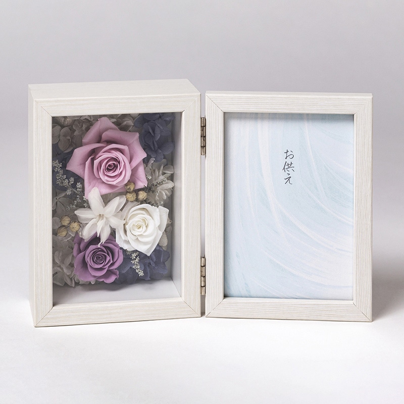フォトフレーム型のお供え用のプリザーブドフラワーアレンジです。