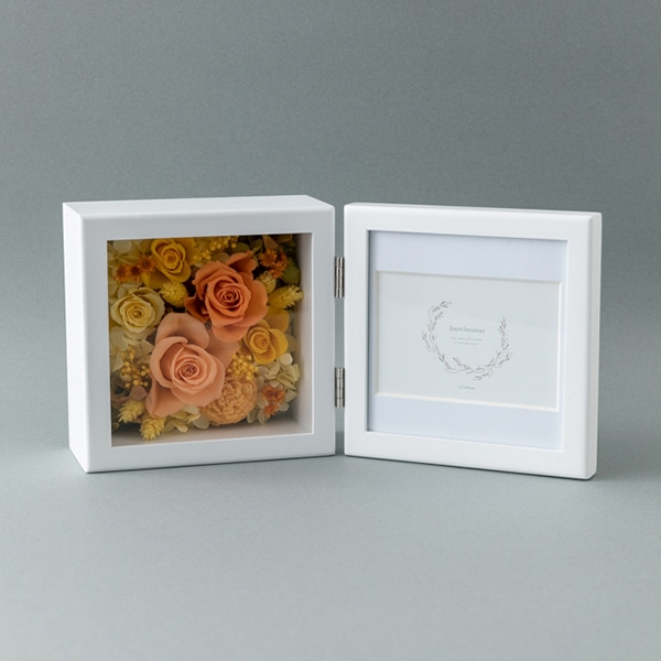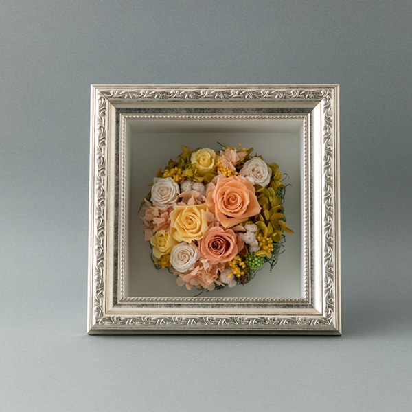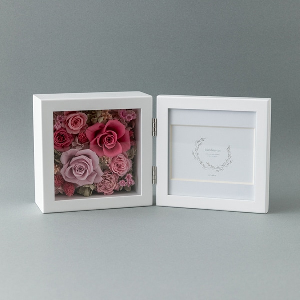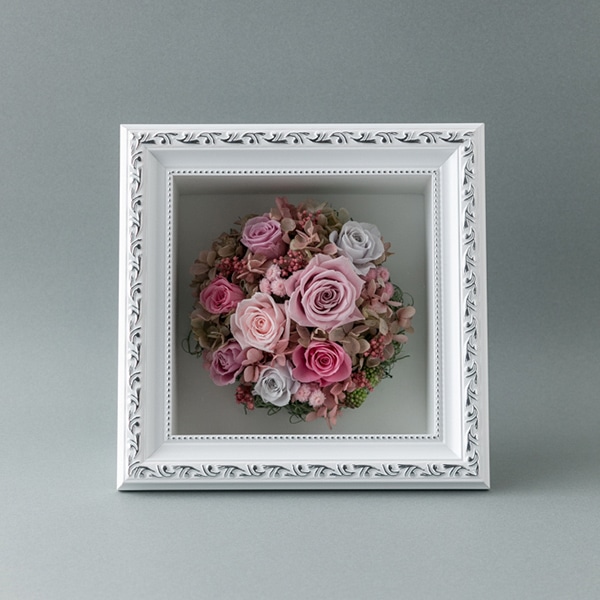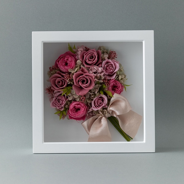 プリザーブドフラワーのブーケをガラスのフレームに閉じ込めました。置き型・壁掛けなど様々なお部屋のシーンに合わせてお飾りが楽しめます。