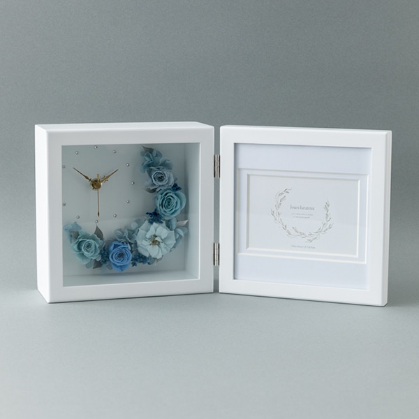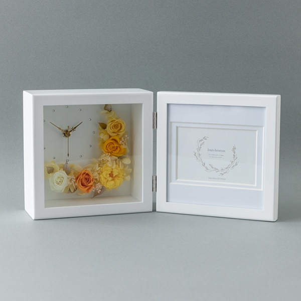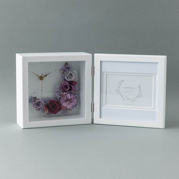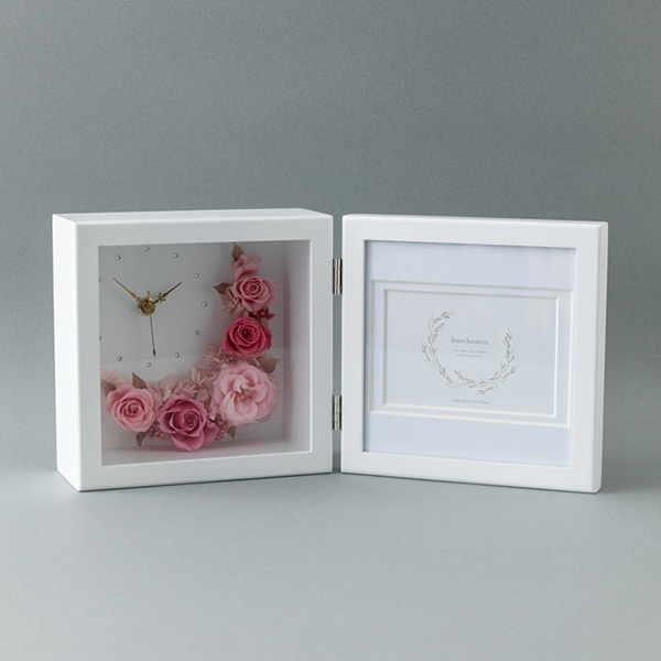 真っ白いフレームに色鮮やかな「プリザーブドフラワーアレンジ」と「時計」と「写真」がセットできる3点ギフトセット商品です。写真の向きも縦横入れ替えることが出来ます。