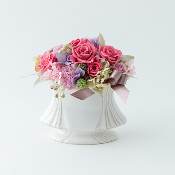 プリザーブドフラワーギフトの業務用商品をお安い価格でお求めいただける通販ページです。プリザーブドフラワーギフトは、花束やアレンジメントなどのフラワーギフトの中でも、特に長期間美しさを保つことができることで人気があります。誕生日や結婚、還暦や退職、母の日や記念日など様々なお祝いのシーンで贈られることが多く、メッセージカードを添えることでさらに心のこもったギフトになります。また、お供え用のアレンジメントとしてもおすすめです。ピンクのローズをメインにしたアレンジメントは特に人気です。贈り物だけでなく、インテリアとしても楽しめます。