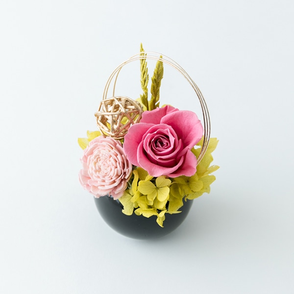 デコラティブなフレームに丸いフォルムに仕上げたプリザーブドフラワーアレンジです。置き用・壁掛け用どちらも可能です。