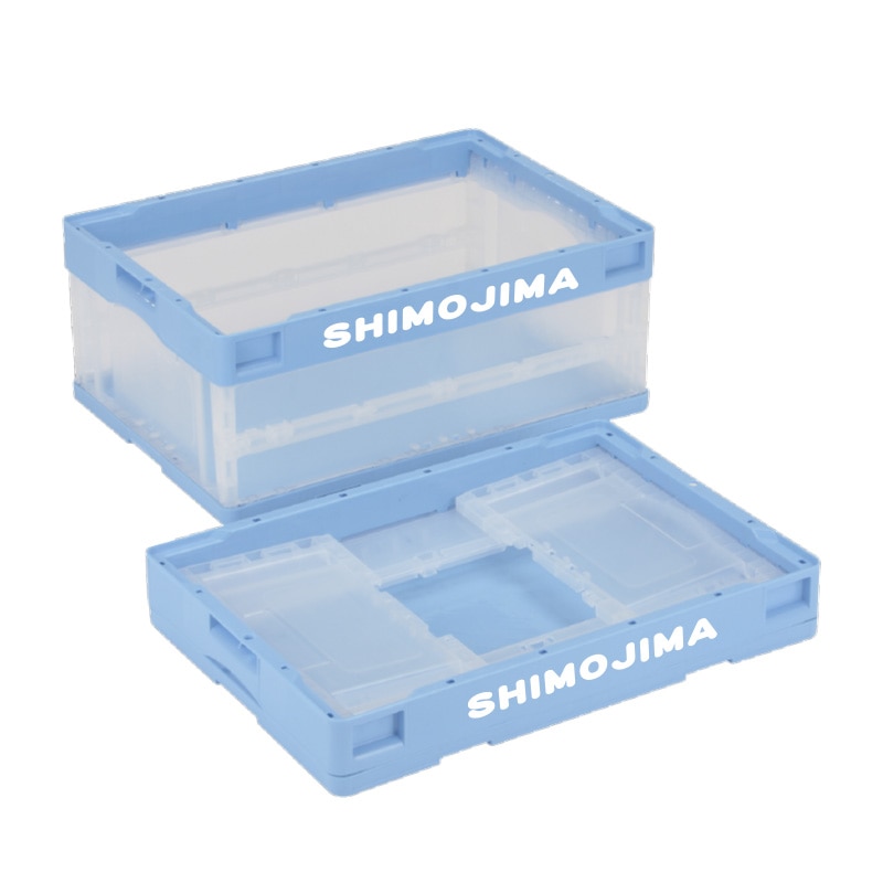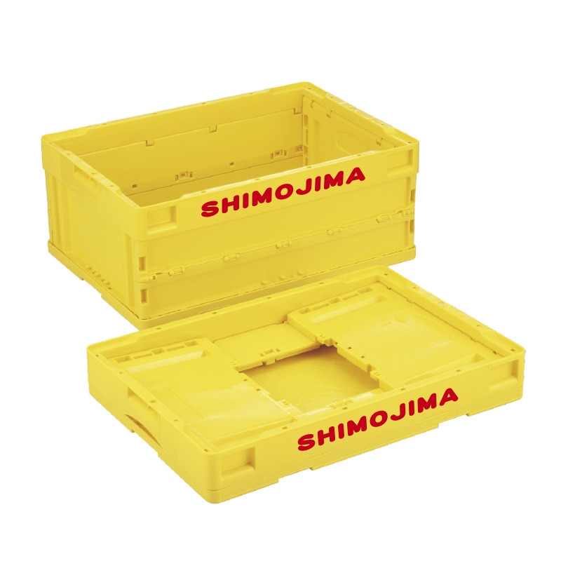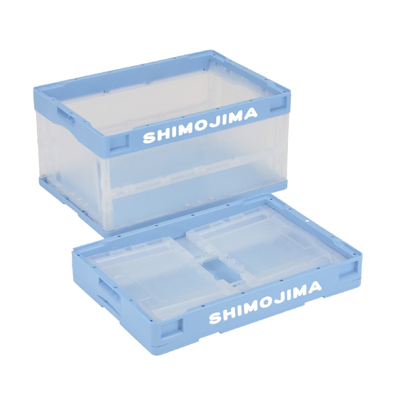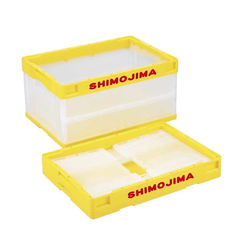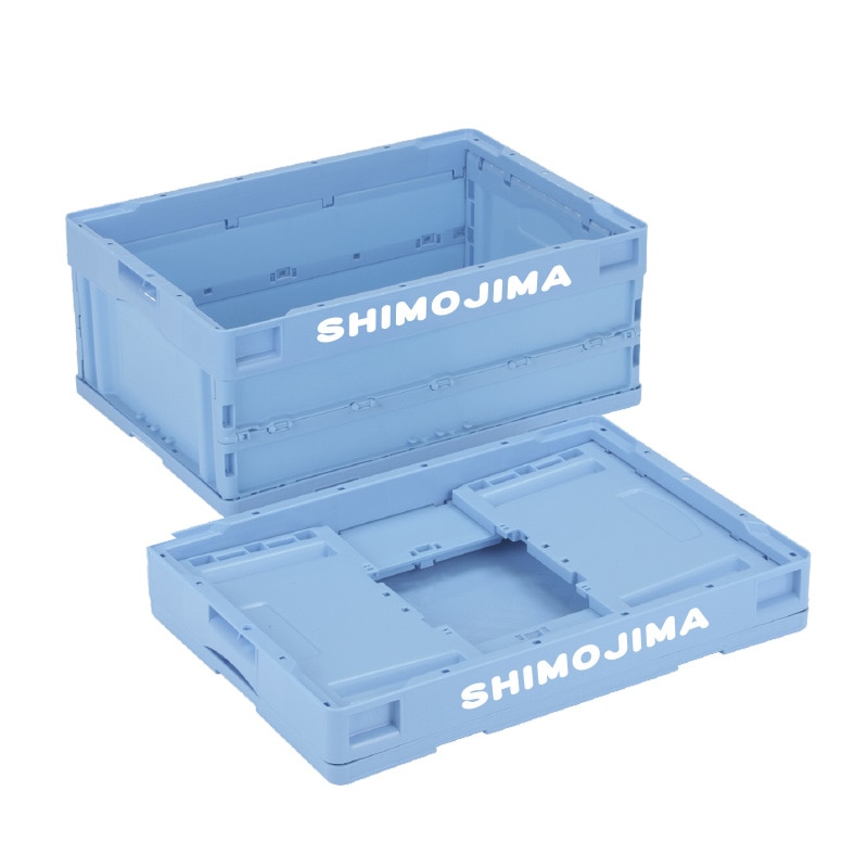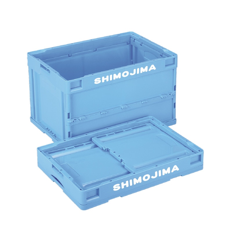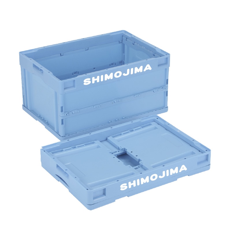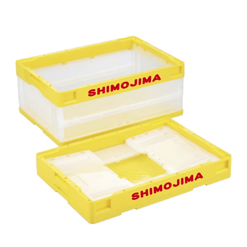 折りコンの長側面口枠(両面)に1色印刷●印刷色:黒もしくは白●蓋なし●容量:50リットル●有効内寸:493×335×305mm●圧縮荷重:6270N●オールプラスチック製●積み重ね可能