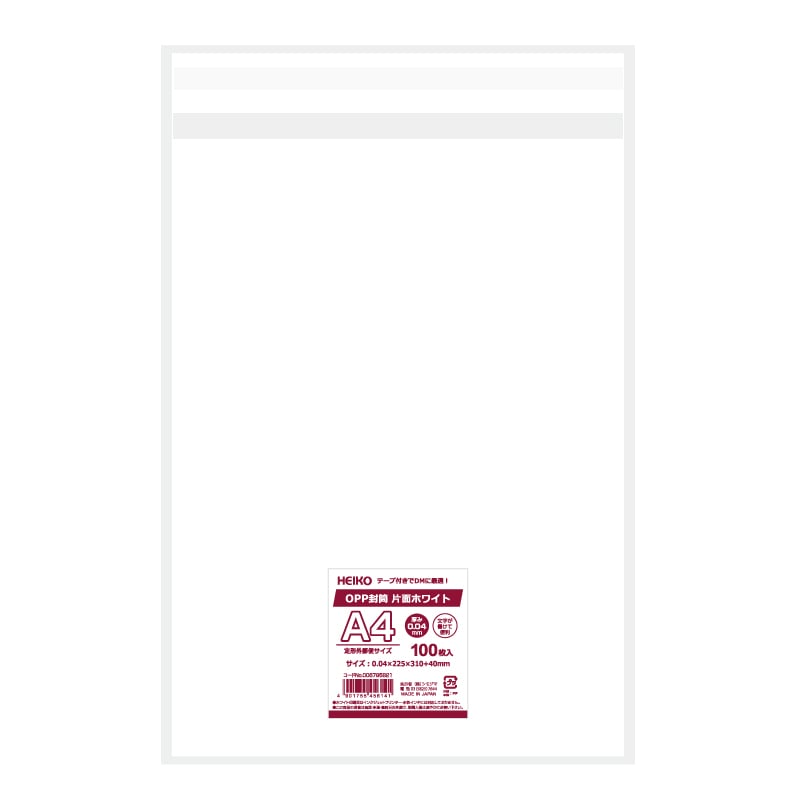 DMやポスティングの包装資材として最適な、テープ付きの透明OPP封筒です。定形長3封筒と同規格で、A4三つ折りが入る大きさです。チラシや案内状の発送などに。表面のみ全面ホワイト色になっているため、油性マジックなどで書き込みができます。(インクジェットプリンター・水性インキには対応しておりません。)厚さ0.04mmの厚口タイプ。●入数:100枚
