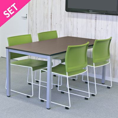 商談スペースや小規模ミーティングルームに適したミーティングセット4人用。使い勝手のよいシンプルなミーティングテーブルW1500xD750ダーク1台とBONUMループ脚チェアグリーン4脚がセットになっています。テーブル天板はキズの付きにくいメラミン樹脂化粧仕上げ、丈夫なフレーム構造で、天板耐荷重は約40Kgです。チェアは、背座がPP樹脂製で汚れてもお手入れ簡単、スチールのループ脚で安定感があります。最大7脚までスタッキングでき、省スペース収納が可能です。●テーブルは組み立て式、チェアは完成品です。●お客様組立て商品です(2人以上で約25分)●チェア=背面:ポリプロピレン/座面:ポリプロピレン/脚フレーム:スチール(粉体塗装)