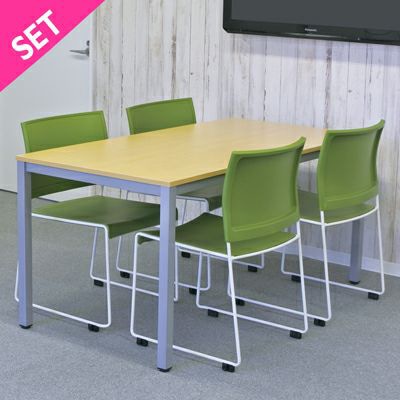 商談スペースや小規模ミーティングルームに適したミーティングセット4人用。使い勝手のよいシンプルなミーティングテーブルW1500xD750ナチュラル1台とBONUMループ脚チェアグリーン4脚がセットになっています。テーブル天板はキズの付きにくいメラミン樹脂化粧仕上げ、丈夫なフレーム構造で、天板耐荷重は約40Kgです。チェアは、背座がPP樹脂製で汚れてもお手入れ簡単、スチールのループ脚で安定感があります。最大7脚までスタッキングでき、省スペース収納が可能です。●テーブルは組み立て式、チェアは完成品です。●お客様組立て商品です(2人以上で約25分)●チェア=背面:ポリプロピレン/座面:ポリプロピレン/脚フレーム:スチール(粉体塗装)