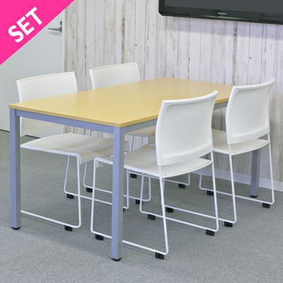 商談スペースや小規模ミーティングルームに適したミーティングセット4人用。使い勝手のよいシンプルなミーティングテーブルW1500xD750ナチュラル1台とBONUMループ脚チェアホワイト4脚がセットになっています。テーブル天板はキズの付きにくいメラミン樹脂化粧仕上げ、丈夫なフレーム構造で、天板耐荷重は約40Kgです。チェアは、背座がPP樹脂製で汚れてもお手入れ簡単、スチールのループ脚で安定感があります。最大7脚までスタッキングでき、省スペース収納が可能です。●テーブルは組み立て式、チェアは完成品です。●お客様組立て商品です(2人以上で約25分)●チェア=背面:ポリプロピレン/座面:ポリプロピレン/脚フレーム:スチール(粉体塗装)