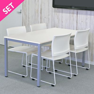 商談スペースや小規模ミーティングルームに適したミーティングセット4人用。使い勝手のよいシンプルなミーティングテーブルW1500xD750ホワイト1台とBONUMループ脚チェアホワイト4脚がセットになっています。テーブル天板はキズの付きにくいメラミン樹脂化粧仕上げ、丈夫なフレーム構造で、天板耐荷重は約40Kgです。チェアは、背座がPP樹脂製で汚れてもお手入れ簡単、スチールのループ脚で安定感があります。最大7脚までスタッキングでき、省スペース収納が可能です。●テーブルは組み立て式、チェアは完成品です。●お客様組立て商品です(2人以上で約25分)●チェア=背面:ポリプロピレン/座面:ポリプロピレン/脚フレーム:スチール(粉体塗装)