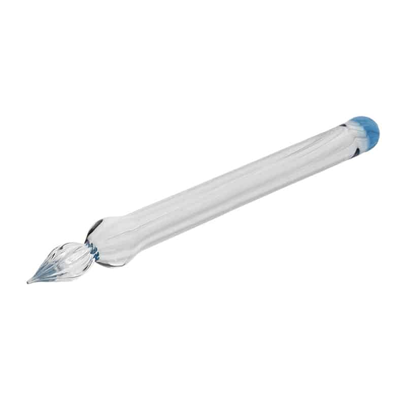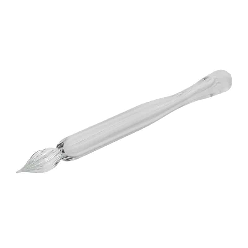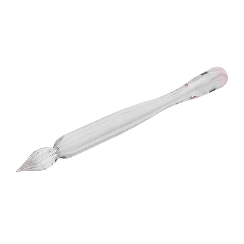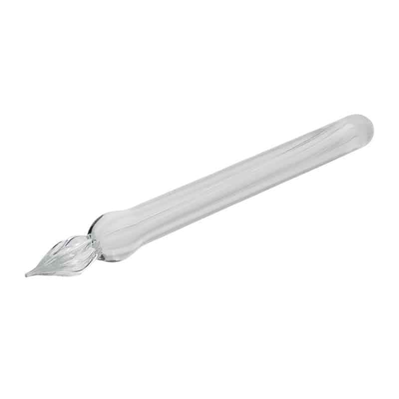 ガラスペンは実用的な筆記具であってほしいという想いから、安心感のある太い軸、持ち運べるコンパクトな長さに仕上げました。ワンポイントのみ色を添えた、上品でシンプルなデザイン。光を受けてペン先に色が反射し、書くたびに美しさを感じられます。装飾がないので、左利きの方にも愛用されています。持ち手がくびれているので、手になじみます。ガラスペンを水の中で軽くゆすれば、簡単にインクが落とせます。※手づくりの為、寸法や書き味に個体差が出る場合があります。●字幅:中細~中字程度