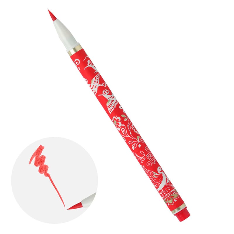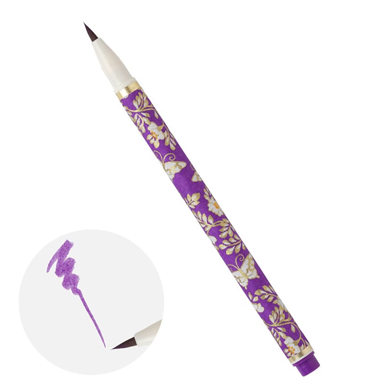 弾力に富んだ特殊繊維を使用し、まとまりに優れた誰にも書きやすい毛筆ペンです。本物の筆と同じ毛組みで手づくりしており、本格派の毛筆タッチで、穂先がきき細くも太くも書ける万能な中字タイプです。インク量が一定に出る中綿式で安定した書きごこちです。水性染料インク使用。