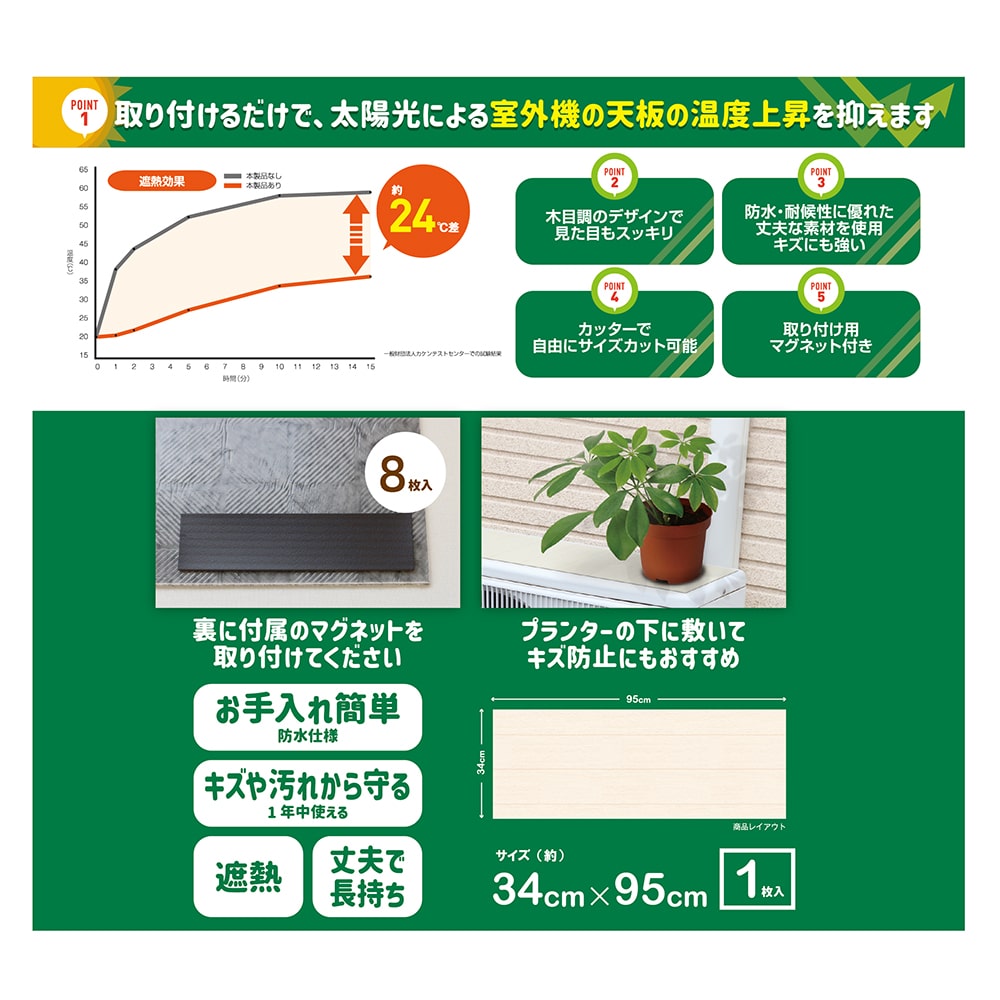 ●取り付けるだけで太陽光による室外機天板の温度上昇を抑えます。●防水・耐候性に優れた素材のため、夏冬問わずオールシーズン使用可能です。●キズにも強く汚れ防止にも適しています。●遮熱剤を配合しているため、遮熱性能が優れています。●カッターなどで自由にカットでき、好きなサイズで使用可能です。●サイズ(mm):340×950●入数:1枚●材質:表面/PVC、中間層/特殊ガラス繊維・PVC、裏面/ポリエステル●色:白・木目調●取り付け用マグネット8枚入●こちらの商品は事業者様向け商品です。