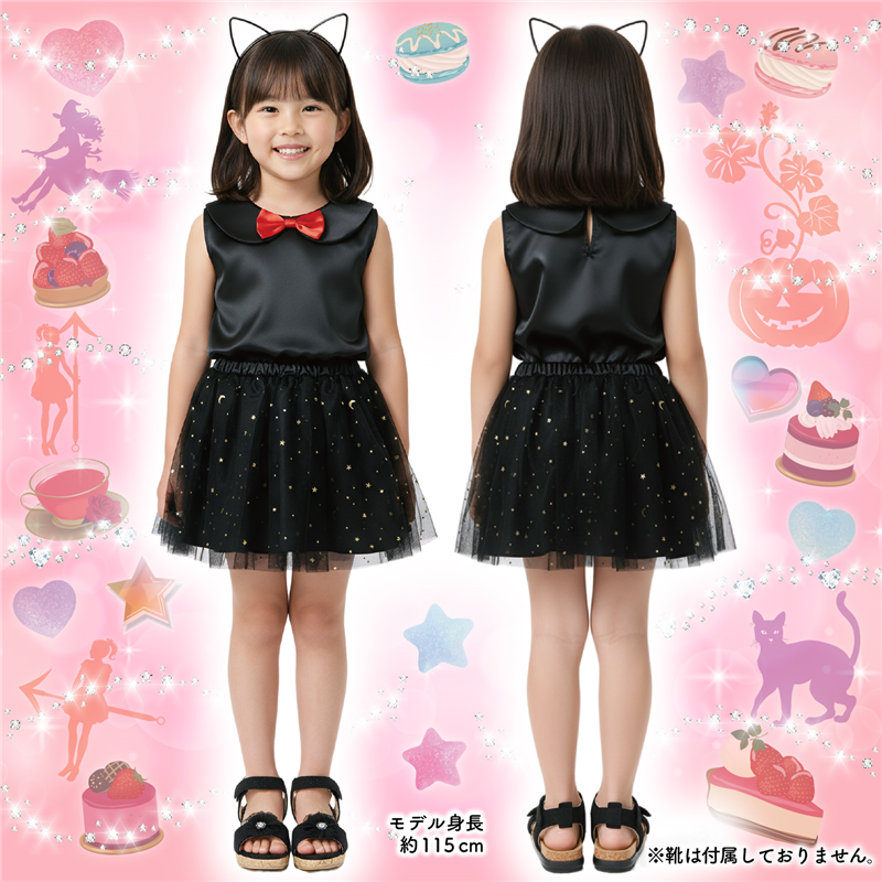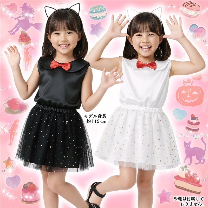 トップス、スカート、蝶ネクタイ、カチューシャがそろった4点セットです。ソフトサテンの素材感で着心地もよく、かわいらしい猫スタイルに仕上がります。サイズは3~4歳の幼児向けでハロウィンや発表会、イベントなど幅広く活躍するコスチュームです。●トップス:着丈400mm、身幅380mm、スカート:φ400~940mm×約300mm、蝶ネクタイ:リボン約60×100mm、ひも首まわり約340~420mm、カチューシャ:140×150mm●シャツ(ソフトサテンシャツ 丸襟付 C)×1、スカート(ソフトサテンチュールスカート)×1、蝶ネクタイ(ソフトサテン蝶ネクタイ)×1、カチューシャ(耳付カチューシャ)×1