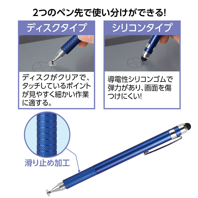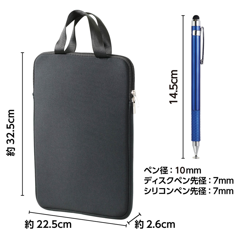 PCやタブレットを衝撃から守るクッションケースと、ディスク・シリコンの2WAYタッチペンを組み合わせたお得なセットです。クッションケースは開け閉めしやすいWファスナー付きで、11.6インチまでのPC・タブレットに対応し、衝撃を軽減してしっかり保護します。持ち手付きで持ち運びやすく、軽量で使いやすい仕様です。ビジネスや学習シーンにぴったりのシンプルデザインです。タッチペンはディスク型とシリコン型の2WAY仕様で使い分けできます。繊維型は画面を傷つけにくく、安定した書き心地を実現。ディスク型はクリアで視認性が高く、繊細な描画もスムーズ。滑り止めグリップ付きで快適に操作できます。アルミボディで軽量かつ高級感のある仕上がりです。スマホやタブレットの操作にかかせないアイテムです。●PCタブレット用クッションケース M:225×325×26mm(外寸)、220×310×10mm(外寸)、2WAYタッチペン本体:約145×φ10mm(ディスクペン先径約7mm、導電繊維先径約7mm)、2WAYタッチペンフタ:φ10×23mm●PCタブレット用クッションケース M ブラック×1、2WAYタッチペン ブルー×1●タブレットは付属しておりません。タッチペンのディスクのペン先を引っ張らないでください。破損の原因となります。ディスクのペン先が抜けてしまった場合、シルバーのペン先を外し、ペン先に黒い部分を差し込み後ろから引っ張って戻してください。