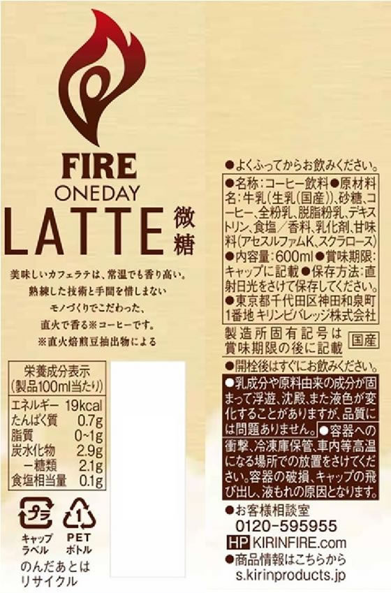 キリン ファイア ワンデイラテ微糖 600ML×24本 1箱※軽(ご注文単位1箱)【直送品】