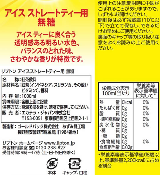 リプトン アイスストレートティー 無糖 1L 6本 1箱※軽(ご注文単位1箱)【直送品】