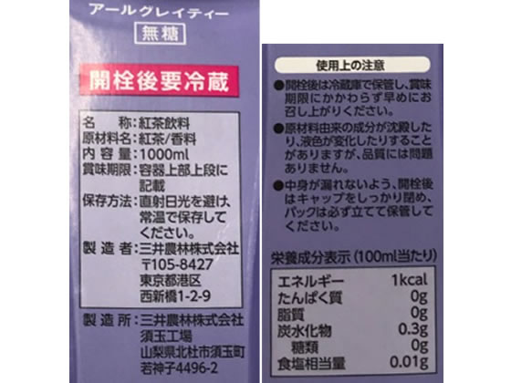 三井農林 ホワイトノーブルリキッドティー アールグレイ無糖 1L 1本※軽(ご注文単位1本)【直送品】