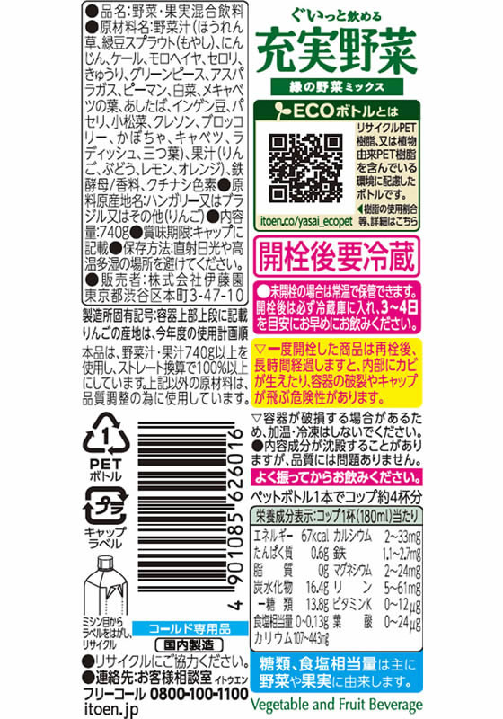 伊藤園 充実野菜 緑の野菜ミックス 740g×15本 1箱※軽(ご注文単位1箱)【直送品】