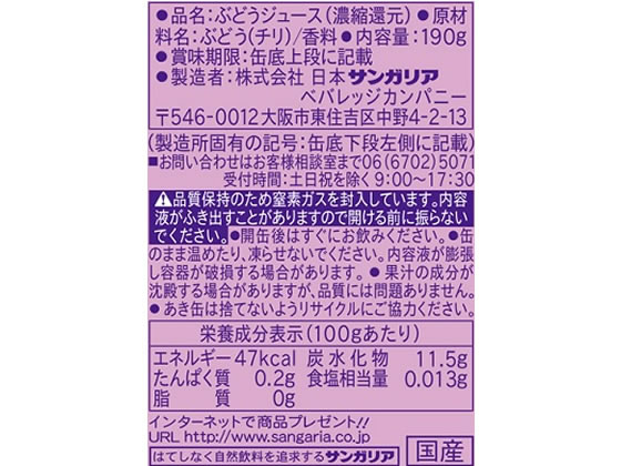 サンガリア 100%赤ぶどうジュース 190g缶 1缶※軽(ご注文単位1缶)【直送品】