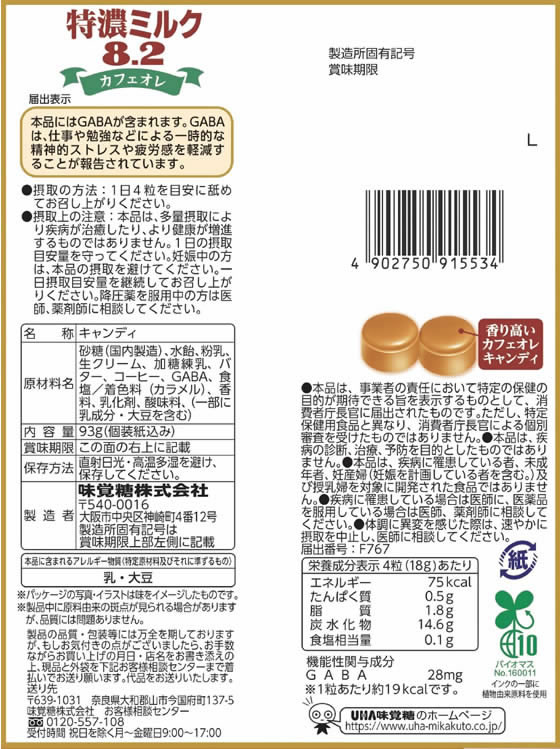 ストレスを軽減したい方に! 仕事や勉強による一時的な精神的ストレスを軽減することが報告されているGABAを配合した特濃ミルク。贅沢な味わいの珈琲と濃厚なミルクの深い味わいが楽しめます。 ●カフェオレ機能性関与成分:GABA届出番号:F767届出表示:本品にはGABAが含まれます。GABAは、仕事や勉強などによる一時的な精神的ストレスや疲労感を軽減することが報告されています。一日当たりの摂取目安量:1日4粒を目安に舐めてお召し上がりください。摂取上の注意:・本品は、多量摂取により疾病が治癒したり、より健康が増進するものではありません。1日の摂取目安量を守ってください。・妊娠中の方は、本品の摂取を避けてください。・一日摂取目安量を継続してお召し上がりください。・降圧薬を服用中の方は医師、薬剤師に相談してください。食生活は、主食、主菜、副菜を基本に、食事のバランスを。生産国:日本商品区分:機能性表示食品メーカー:味覚糖株式会社※メーカーの都合により、パッケージ・仕様等は予告なく変更になる場合がございます。