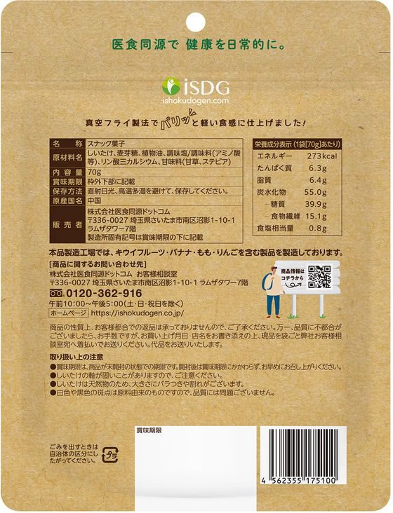 医食同源 しいたけスナック うま塩味 70g 1個※軽(ご注文単位1個)【直送品】