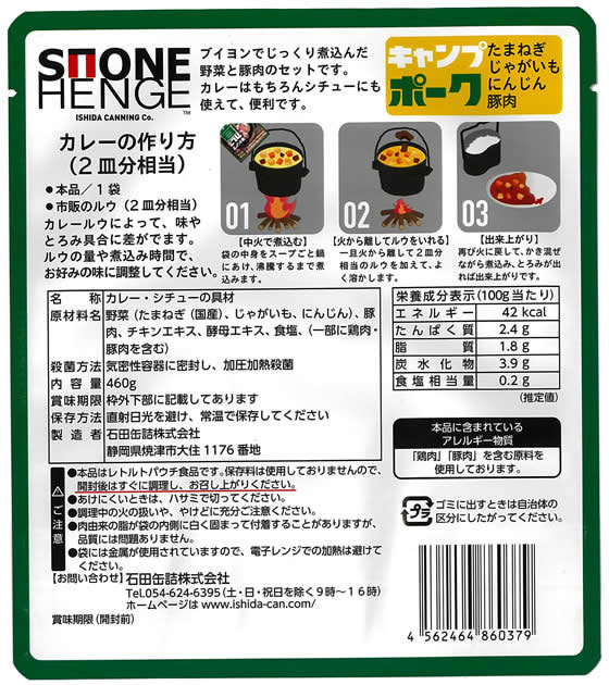 石田缶詰 キャンプ カレーの具 ポーク 2皿分 1袋※軽(ご注文単位1袋)【直送品】