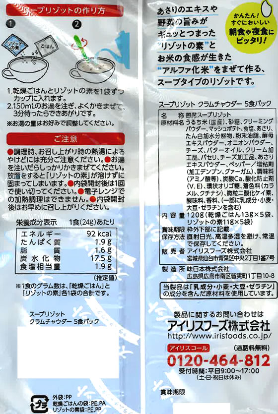 アイリスフーズ すぐにおいしいスープリゾット クラムチャウダー 5食入 1パック※軽(ご注文単位1パック)【直送品】
