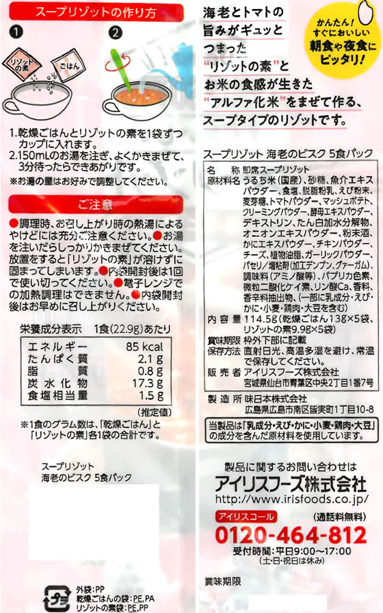 アイリスフーズ すぐにおいしいスープリゾット 海老のビスク 5食入 1パック※軽(ご注文単位1パック)【直送品】