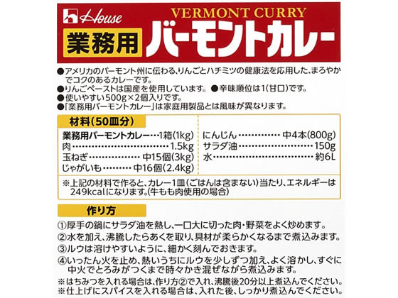 まろやかでコクのあるカレーを提供できます。 りんごペーストとはちみつの他に、トマトパウダー、バナナペースト、乳製品などを加え、深みのあるマイルドな味に仕上げました。 ●内容量:1kg(500g×2個入)●約50皿分●辛味順位:1(甘口)※業務用バーモントカレーは、家庭用製品とは風味が異なります。※メーカーの都合により、パッケージ・仕様等は予告なく変更になる場合がございます。