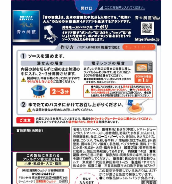 日清製粉ウェルナ 青の洞窟 あさりと完熟トマトのボンゴレロッソ 1箱※軽(ご注文単位1箱)【直送品】