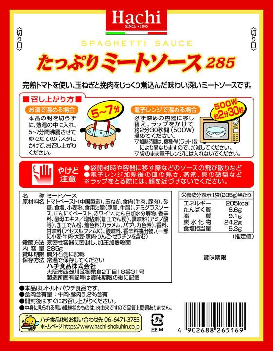 ハチ食品 たっぷりミートソース 285g 1個※軽(ご注文単位1個)【直送品】