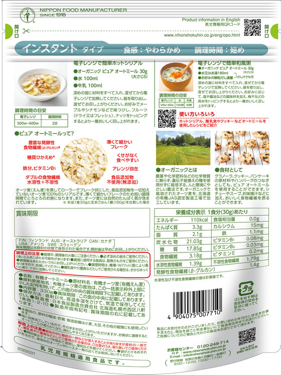日本食品製造 オーガニックピュアオートミール 330g 1袋※軽(ご注文単位1袋)【直送品】