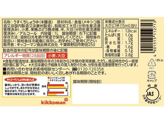 キッコーマン うすくちしょうゆ 1L 1本※軽(ご注文単位1本)【直送品】