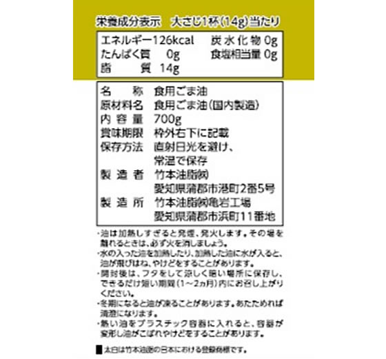 竹本油脂 マルホン 太白 胡麻油 700g 1本※軽(ご注文単位1本)【直送品】
