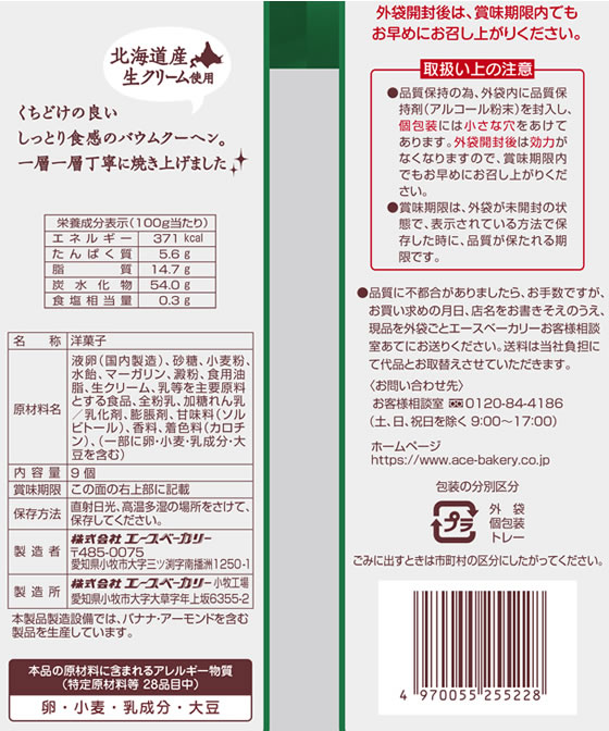 エースベーカリー 9個厚切りバウム ※軽(ご注文単位)【直送品】
