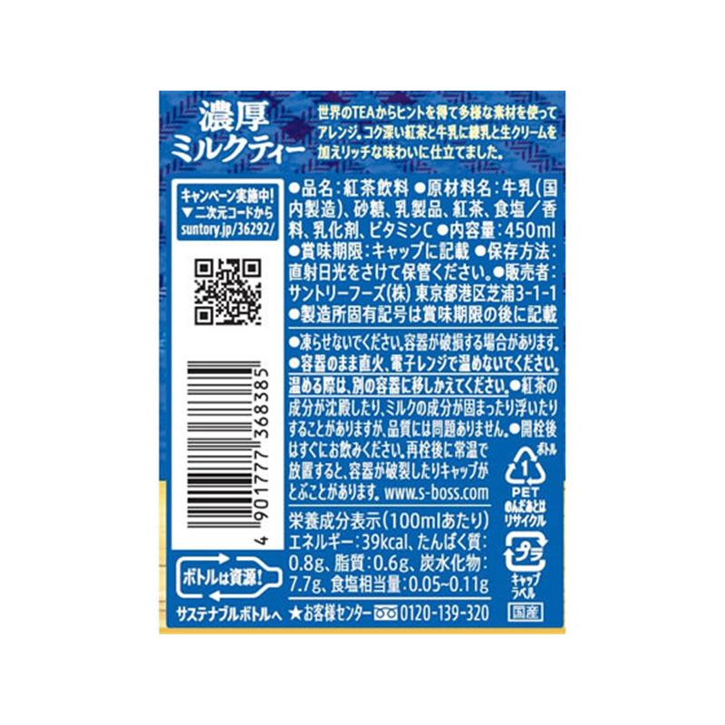 サントリー クラフトボス 濃厚ミルクティー ホット 450mL×24本 1箱※軽(ご注文単位1箱)【直送品】