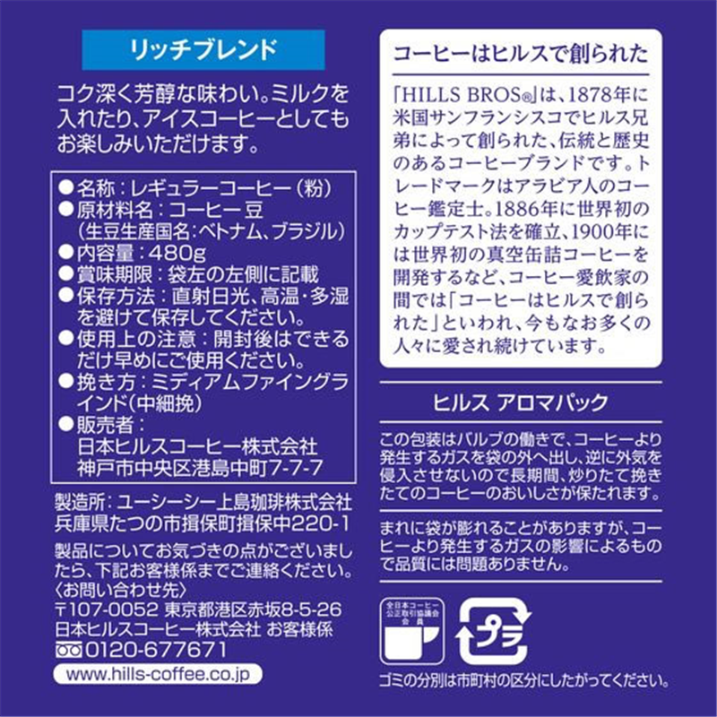 日本ヒルスコーヒー ヒルス リッチブレンド 480g 1袋※軽(ご注文単位1袋)【直送品】
