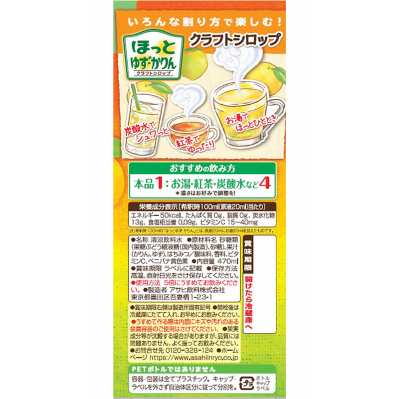 アサヒ飲料 クラフトシロップ ほっとゆず・かりん 470mL×12本 1箱※軽(ご注文単位1箱)【直送品】
