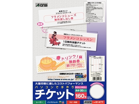 エーワン 手作りチケット 半券なし A4 8面 ホワイト 20シート 51477 1冊(ご注文単位1冊)【直送品】