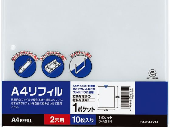 コクヨ クリアーブック A4リフィル 1ポケット 2穴 10枚入 ラ-A21N 1パック(ご注文単位1パック)【直送品】