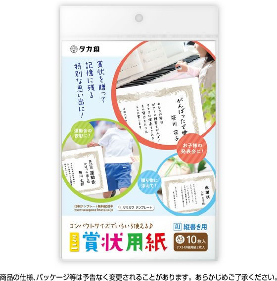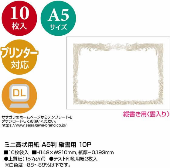 ササガワ ミニ賞状用紙 A5判 縦書用 10枚 10-1550 1袋(ご注文単位1袋)【直送品】