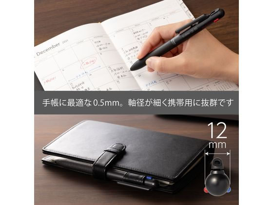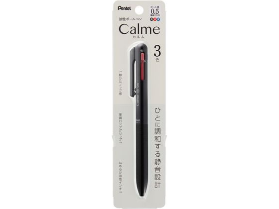 なめらか油性ボールペンCalme(カルム)は人に調和する静音設計になっています。 静かなノック感、革調のロンググリップ、マットな質感を備えたなめらか油性ボールペン。自分が心地よく使えるのはもちろん、周りの人や環境にもなじむように配慮した設計になっています。ノック時の操作音を従来品と比べて66%低減。(ぺんてる製品比、音圧パスカルでの比較)ノック作動時に手に感じる衝撃も和らげています。濃く発色の良いなめらか油性インキを搭載。従来品を改良して筆跡のボテを軽減、書いた後に汚れにくい。 BXAC35Aのパック包タイプ。●仕様:3色ボールペン●軸色:ブラック●インキ色:黒、赤、青●ボールペンインキ成分:油性染料+顔料●ボール径:0.5mm●本体サイズ:18×13×146mm●材質:前軸/PP、後軸・クリップ/PC、スライダー/POM、グリップ/エラストマー●適応リフィル:XBXS5-A(黒)、XBXS5-B(赤)、XBXS5-C(青)●注文単位:1本※メーカーの都合により、パッケージ・仕様等は予告なく変更になる場合がございます。