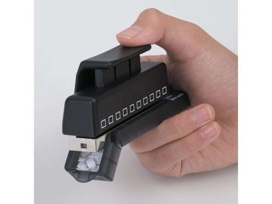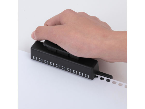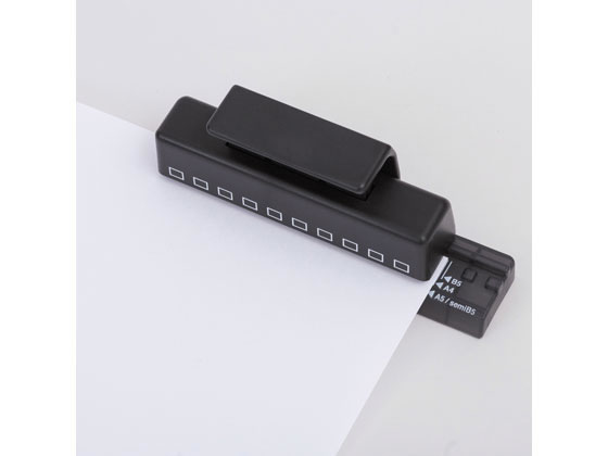 用紙に穴をあけてツイストノートにひとまとめ データ・メモ・時刻表・地図などいろんな書類もこのパンチを使えばノートと一緒に綴じることができ、オリジナルノートとしてひとまとめにできます。パンチは10穴式ですが、本体のガイドを利用し、用紙を移動することにより、10穴以上の穴をあけることができます。スペースを取らないコンパクトサイズ。右側にある用紙ガイドのサイズに合わせて用紙をセットし、本体側面の穴位置ガイドが穴あけ位置の目安になります。 ●外寸法:幅117×奥行き29×高さ48mm●材質:金属部/亜鉛合金、プラスチック部/ABS樹脂・ポリプロピレン※国際標準1/3インチ(8.47mm)ピッチ・角穴(5×4mm)●最大穿孔枚数:コピー用紙1枚(64g/㎡)●JIS規格ピッチA4・30穴、B5・26穴、A5・20穴には対応していません。
