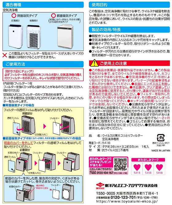 フィルたん ウイルス対策ホコリとりフィルター 空気清浄機用 1枚 1パック(ご注文単位1パック)【直送品】