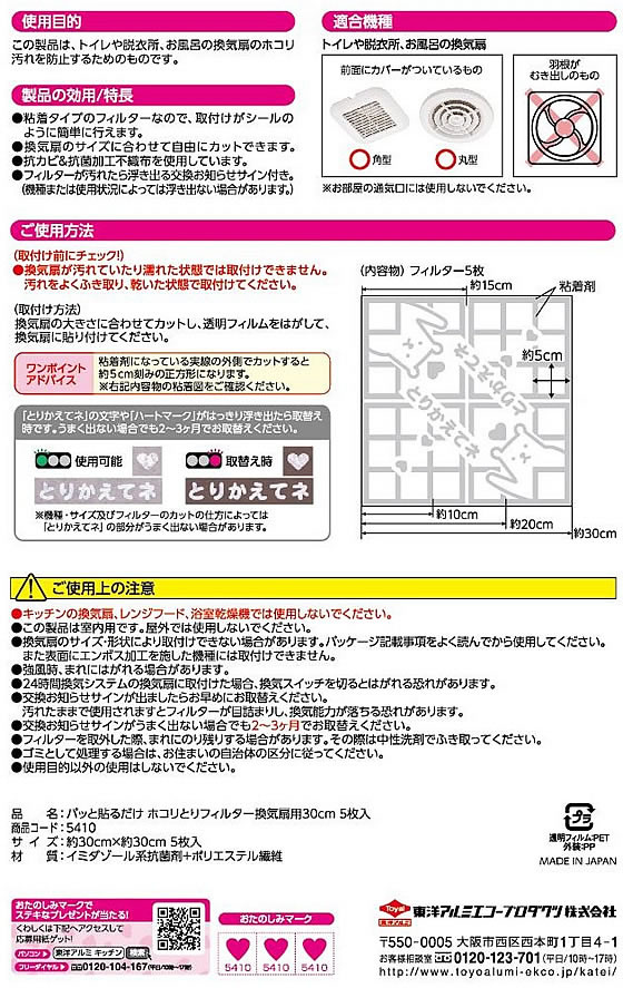 フィルたん パッと貼るだけ ホコリとりフィルター 30cm 5枚 1袋(ご注文単位1袋)【直送品】
