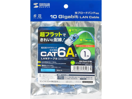 サンワサプライ カテゴリ6A フラットLANケーブル 1m ブルー KB-FL6A-01BL 1本(ご注文単位1本)【直送品】