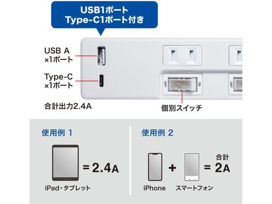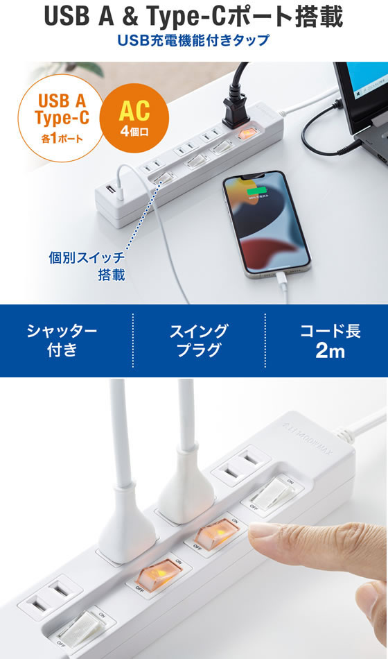 サンワサプライ USB充電機能付きタップType-C搭載 2P 4個口 2m 1個(ご注文単位1個)【直送品】