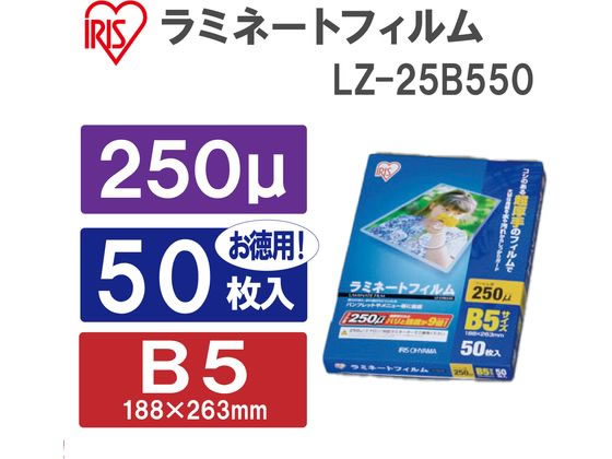 アイリスオーヤマ ラミネートフィルム B5 250ミクロン 50枚 LZ-25B550 1冊(ご注文単位1冊)【直送品】