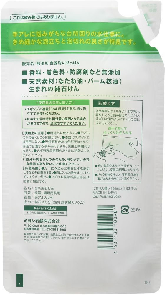 ミヨシ石鹸 無添加食器洗い石鹸 詰替用スタンディング 350ml 1個(ご注文単位1個)【直送品】