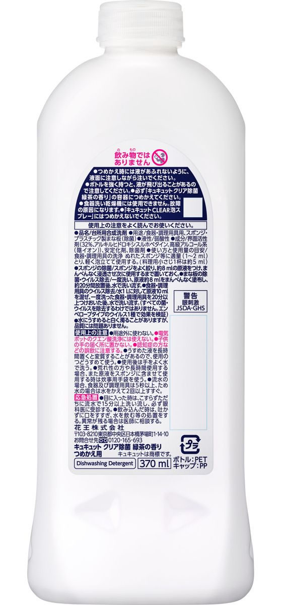 KAO キュキュット クリア除菌 緑茶の香り つめかえ用 370ml 1本(ご注文単位1本)【直送品】