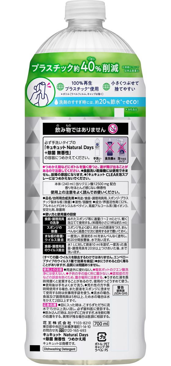 KAO キュキュット NaturalDays+除菌 無香性 詰替 700ml 1本(ご注文単位1本)【直送品】