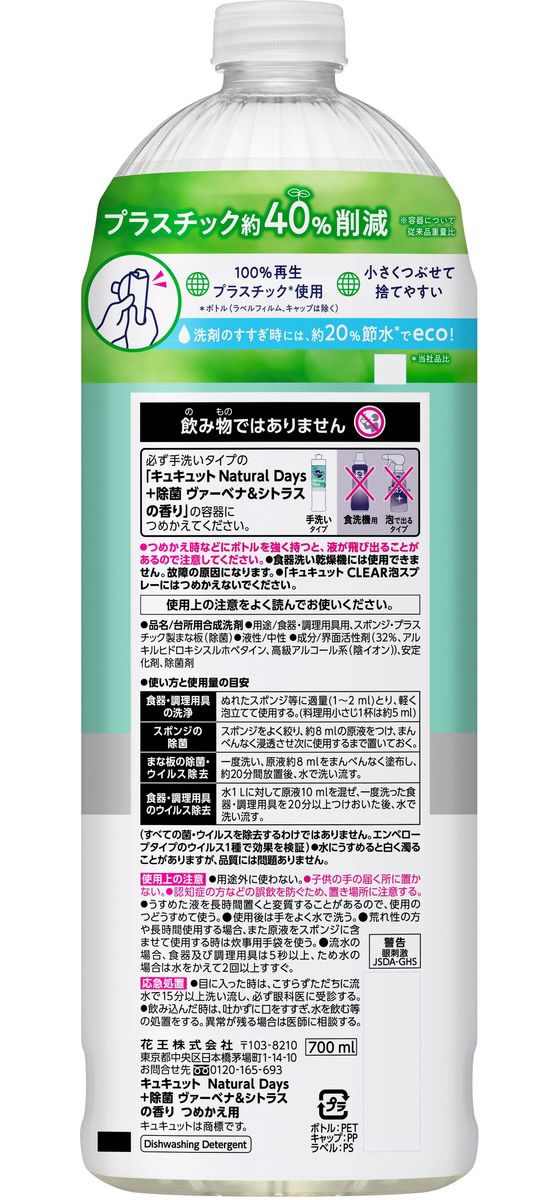 KAO キュキュット NaturalDays+除菌 ヴァーベナ&シトラス 替 700ml 1本(ご注文単位1本)【直送品】